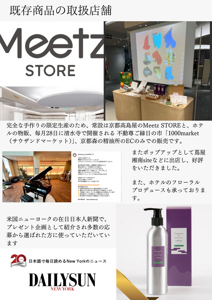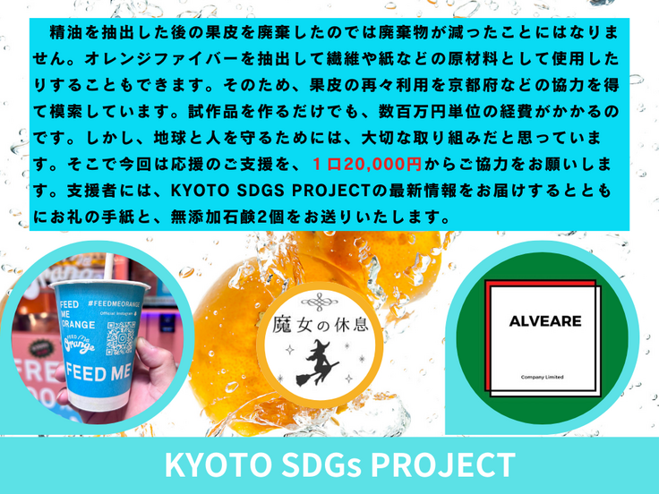 プロジェクト開催期間中9月28日に清水寺境内にて1000marketに参加PRの他9月31日迄インスタ広告などでPRを予定。 資金使途は石鹸とボディ&ヘアオイルミストの研究開発費、READYFOR手数料、コンサル費用、商品の撮影費用、その他、広報費や蒸留後のオレンジの果皮を利用した更なる新商品の研究開発費に使わせていただきます。