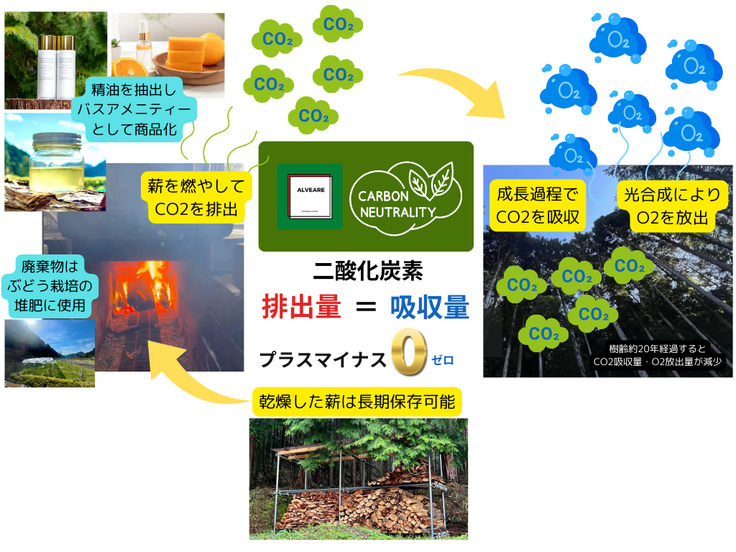 蒸留後に出るヒノキ等チップの廃棄物も、廃棄せずに隣接するぶどう畑の肥料として活用しており、廃棄物を出さずに循環させていく薪窯を使ったシステム作りで脱酸素を実現しています。