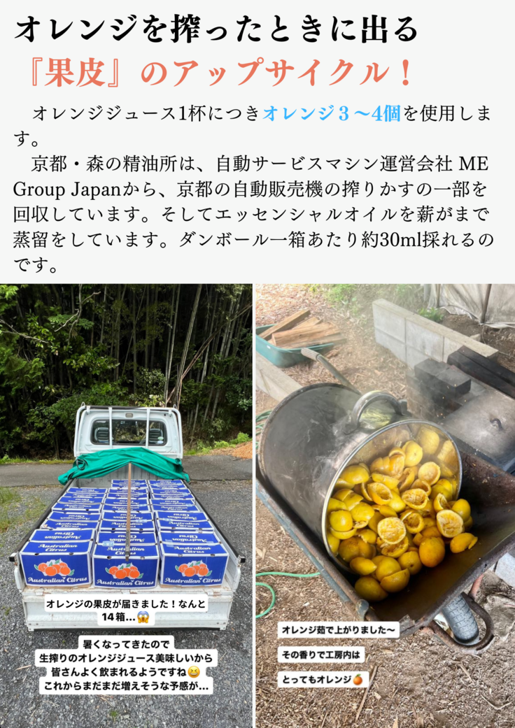 最近マスコミ等で取り上げられている生のオレンジをその場でカットして搾る100%オレンジジュースの自動販売機からは、飲めば飲むほど、消費され廃棄される果皮が発生します。 その果皮を森の精油所の薪窯にてエッセンシャルオイルに蒸留し、廃棄物を活用したアップサイクルしリユース製品に加工して無駄の無い社会づくりの一翼を担いたい!そんな思いから始まったプロジェクトです。その第1歩としてリユースして採れたオレンジ精油にミントを加えた香りの無添加石鹸とボディ&ヘアオイルミストが完成しました!