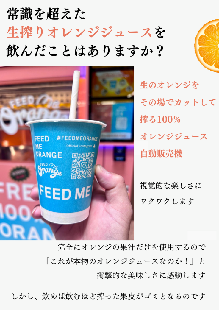 ある時、新聞誌面を見ていると京都市内にて生搾りオレンジジュースの自動販売機が増えてきているとの記事を見つけました。オレンジを搾ってジュースにした後の果皮はどのようにされているのか問い合わせたところ、京都市内の自動販売機の分は回収業者に依頼して最終的に東大阪にて処分しているということがわかりました。