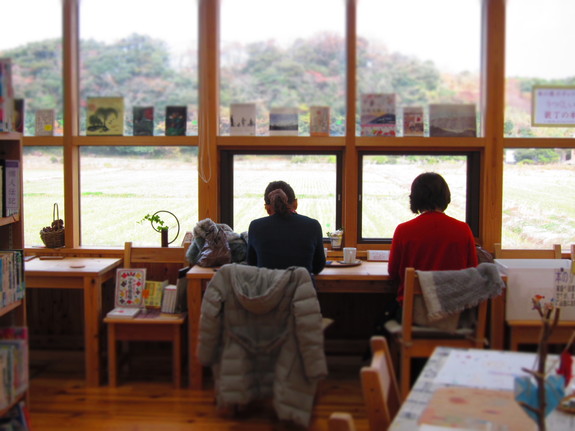 窓際席でのんびりライブラリーカフェを楽しむようす