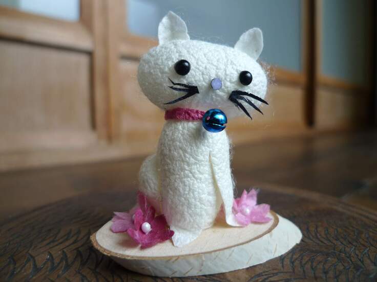 手のひらサイズのかわいい繭細工です。繭の白さを生かした作品です。養蚕の守り神であるネコ、福を呼ぶフクロウの二種類からどちらか一つお選びください。