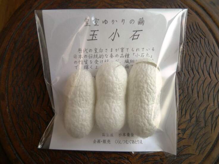 皇室で育てられている日本の伝統的な蚕の品種「小石丸」の性質を受け継いだ、繊細かつ丈夫で、輝くような糸質と、玉繭(偶然できるふたご繭)を作りやすい性質を併せ持つ、希少な品種の繭です。