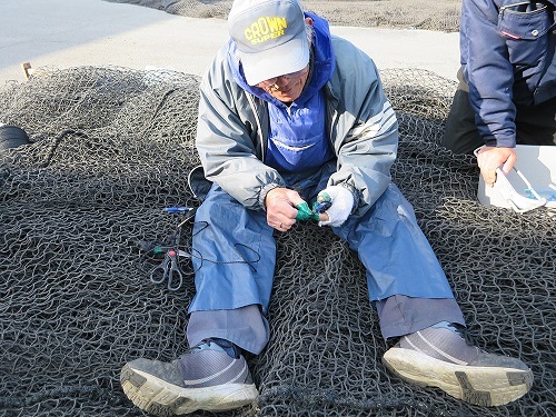 (大型巻き網船の元船員さん。今では養殖に使う網の修理をして支えてくれています。)