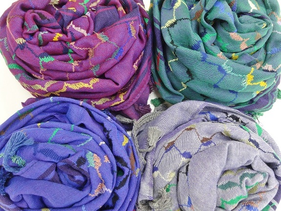 「ラスト・カフィーヤ」は旧式の織り機を使用することで、素朴な風合いが出ています。上質な織り布全面に、ハンドメイド感漂う刺繍で彩られた模様が魅力です。大判の正方形のストールなので、肩に羽織ったり巻き方をアレンジして、年中楽しんで頂けます。生産者が生き残りをかけて商品開発に力を入れているので、同じものを注文しても手に入らない一点ものが多くあります。どれも大量生産にはない魅力あふれる商品です。「世界の火薬庫」と呼ばれるこの地で、こんなにあざやかなストールが作られているのだということをお伝えしたいです。