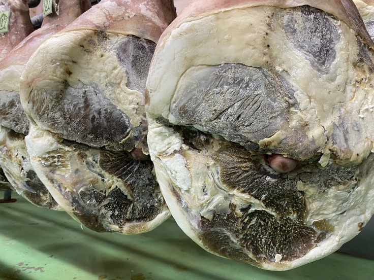 こうして白カビや空気中にいる酵母をつけて熟成をすることにより、ナッツやチーズのような芳醇な香りのする生ハムが出来上がります🥰