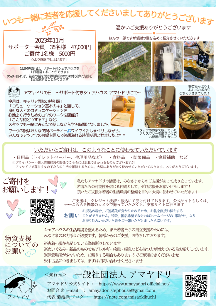 ニュースレター・代表菊池のメルマガを活動報告としてお送りいたしますので、来月以降の配信も楽しみにしてくださいますと幸いです。