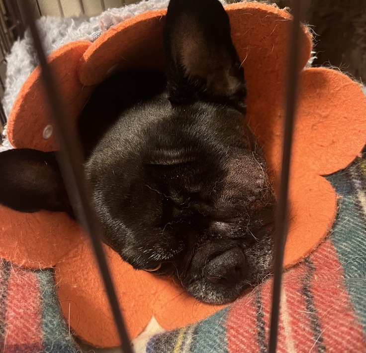 後ろ足で掻こうとしてしまうので、しばらくはエリカラを装着して過ごしています。