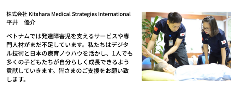 北原グループ(医療法人社団KNI、株式会社KMSI)は、医療を「人が良く生き、より良く最期のときを迎えるまでをプロデュースする総合生活産業」と捉え、ITを含む最先端技術や教育、農業、物流など多分野を結集し、国内外で医療・ヘルスケア事業を展開しています。ベトナムでは2018年より活動を開始し、本プロジェクトでは療育支援ツールの開発・導入を現地窓口として調整し、ベトナムの文化や生活習慣に即した持続的サービスに貢献します。