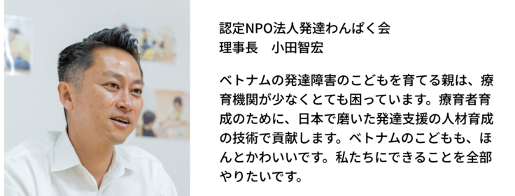 発達わんぱく会は、「すべての子どもが、発達障害を持って生まれても、自立したその人らしい大人になって、豊かな人生を送れる社会」を理念に活動する発達の専門家集団です。日本での経験と知見を活かし、ベトナムの子どもたちの笑顔を作るお手伝いをしたいと考えています。エフバイタル社のAI技術を使い、お子さんの特徴を「見える化」し、対面・オンラインでの研修を通じて療育者を育成。専門家による実践的なプログラムで、質の高い療育をお伝えいたします。