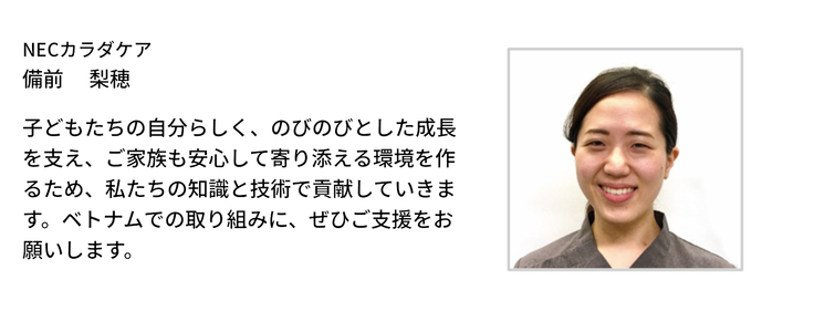 NECカラダケアでは身体の専門家である理学療法士が施術をするサービスを提供しています。理学療法はさまざまな領域・分野で活かせることを信じ、発達障害の子ども向けのプログラム設計・開発をしています。オンラインなども活用して、ベトナム現地で自走できる仕組みの構築を目指しています。