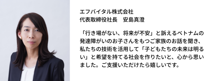 エフバイタルは、生まれた環境に依存せず、生存し、成長し、未来を選択できる社会の実現のために、動画解析AI技術を活用し、医学的知見に基づいた発達と評価の結果から、個別最適化された支援内容を自動推薦するアルゴリズムを開発しました。ベトナムにおいては専門人材の育成が間に合っていないことから、我々の持つテクノロジーが、AME HOUSEの理想の実現に直結すると考えて、このプロジェクトを立ち上げました。