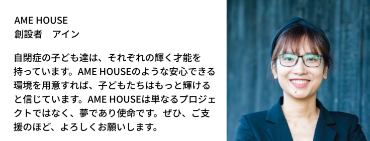 また、地域社会に対して、自閉症への理解を深めてもらい、子どもたちが幸せに生きられる社会を築くことも使命としています。AME HOUSEは、自閉症の子どもたちのより良い未来を願う、夢と使命に満ちた取り組みです。