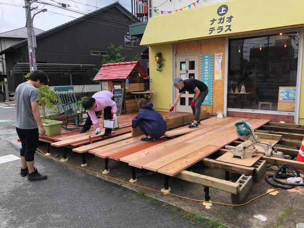 現在、研究費によって建物の前面にデッキと雨水タンクを設置する作業をDIYで進めています。DIYには、樋井川流域でこの考えに賛同していただいている「ミズベリング樋井川」の人々や上ナガオテラスに集う方々など、多くの市民の皆さまにご協力いただきます。
