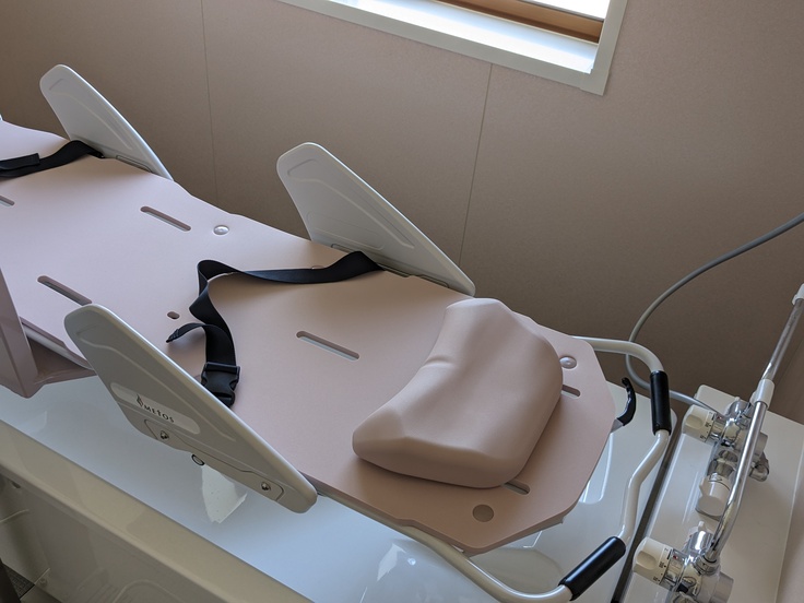 大きめの車イスでも通れる通路や入り口。トイレは複数あり、特殊浴室やトイレには天井走行リフトを設置し、介護者の負担を軽減するなど工夫し、安心して利用できるようにしています。