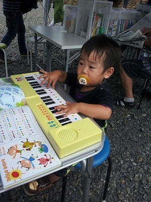(移動図書館では、音の出る楽器も子どものコーナーに置いています)