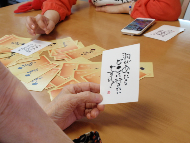 1枚1枚、実際のお年寄りをイメージし、ご本人に語りかけるように「問いかけ」を記しています。ヘルパーさんが親以上年の離れた利用者さまとどんな会話をしたらよいか困惑している状況を目の当たりにすることもありますが、そんな問題も解決できるカードになっています。そしてその「問いかけ」の文字は、温かなぬくもりのある「ひととき」を共にすごす時間になってほしい、という思いから筆ペンで一つ一つ丁寧に書きました。
