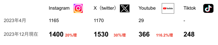 特にyoutubeでは、今年の4月の12倍もの人にフォローしてもらうことができました。