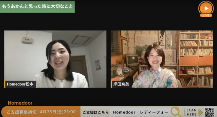 ゲストの岸田奈美さんとHomedoor松本の大学時代のエピソードをはじめ、若年層ホームレス増加の背景や「もうあかん」と思った時に大切な考え方、Homedoorが行なっている取り組みについて、時間のゆるす限り語らせていただきました。