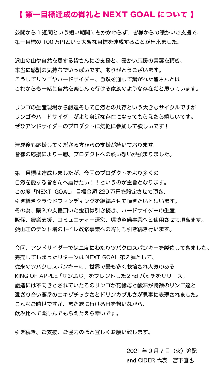 共に持続可能なアウトドアライフ、ハードサイダーやリンゴのカルチャーを思考してくださる方がいらっしゃいましたら嬉しいです。
