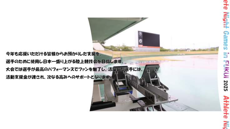 福井陸上競技協会を中心に、今年も日本グランプリシリーズ『ANG2025』を8月15日16日に開催。 支援いただいた資金は各種目上位3位の報奨金、招待選手の招待費用として使用。 リターンの発送は9/30までに完了させます。