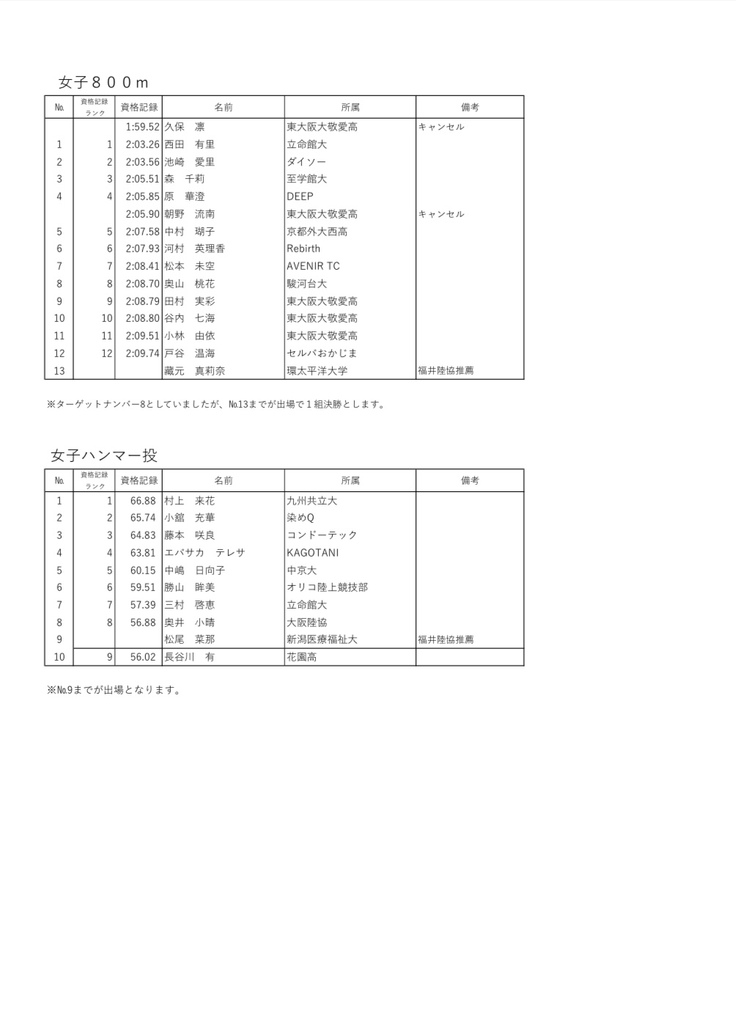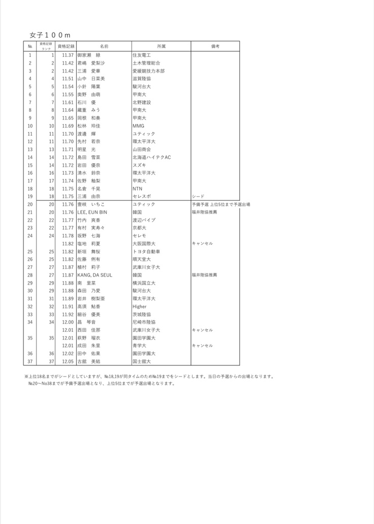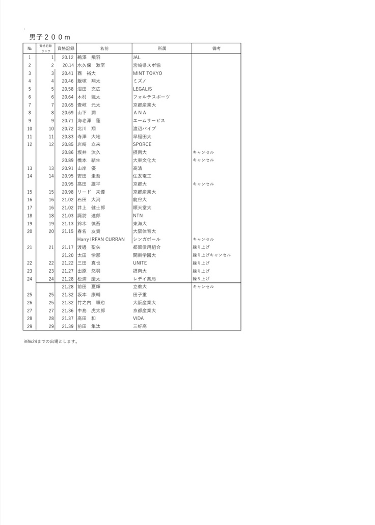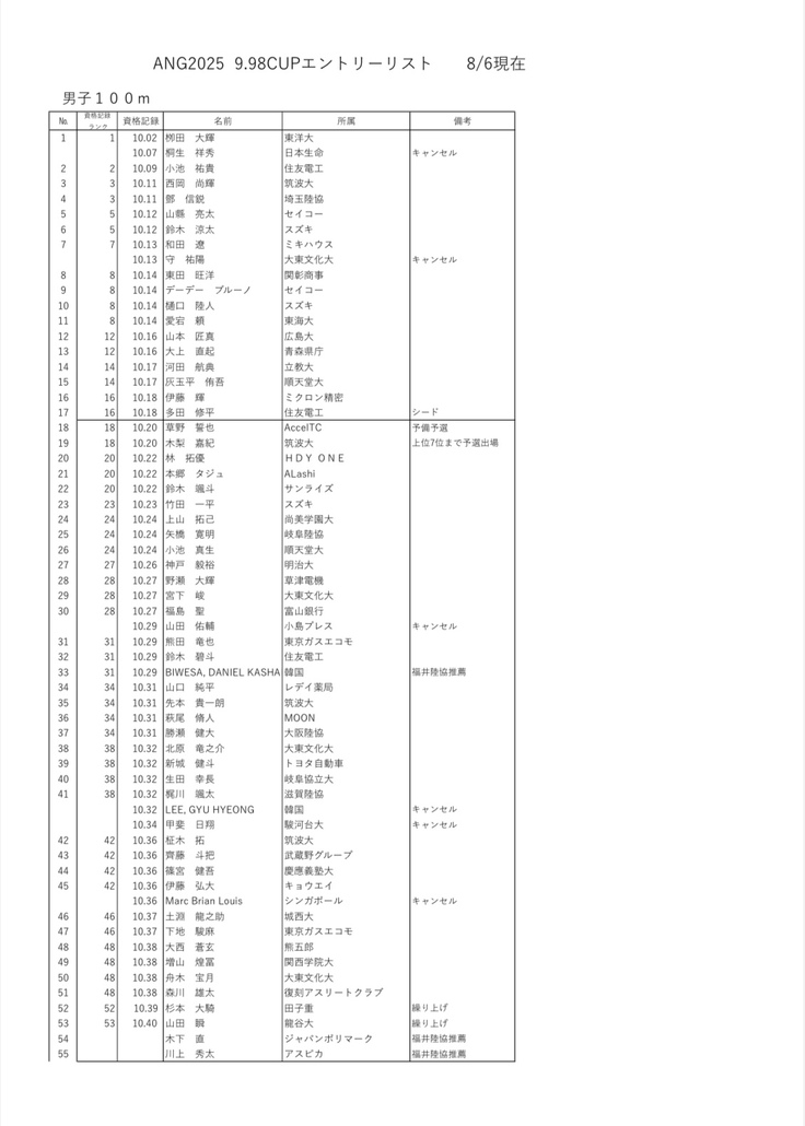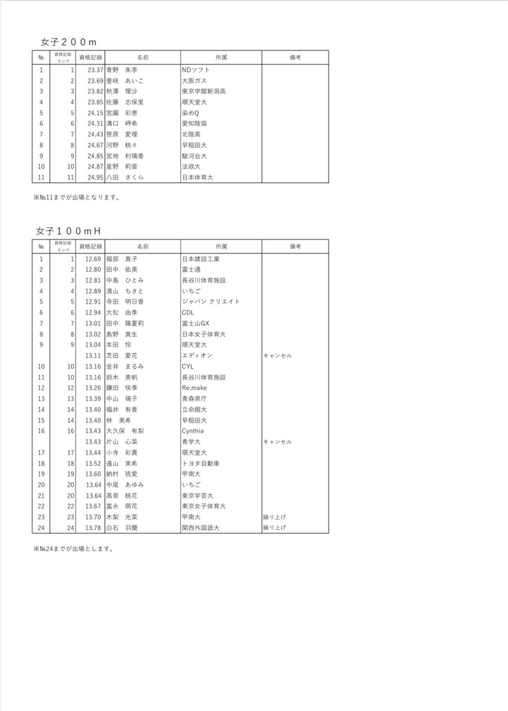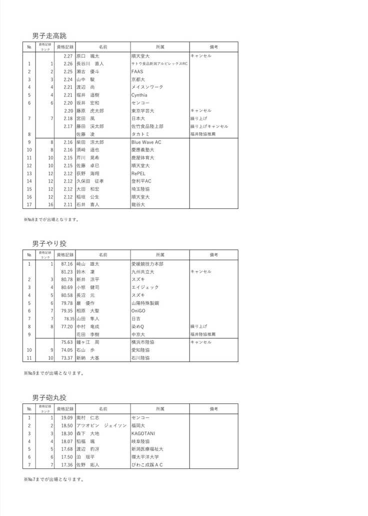 世界陸上出場内定し、これから調整のためANG出場は辞退された選手がいらっしゃいますが