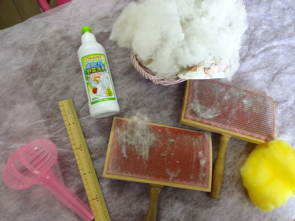 写真に写っている、大きな重たいブラシを使い、羊毛をのばします。
