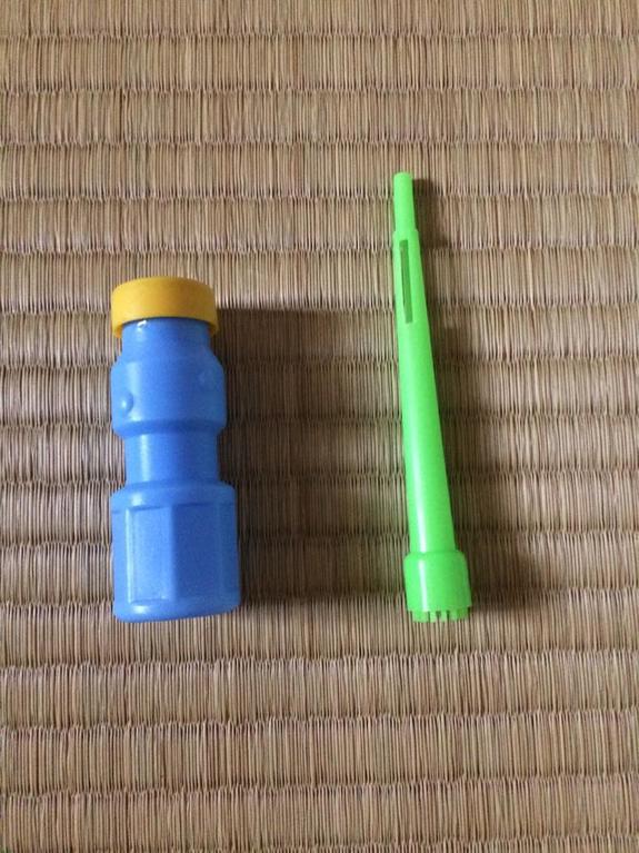 瓶の中に入っている色水は、シャボン玉液と絵具を混ぜて使います。