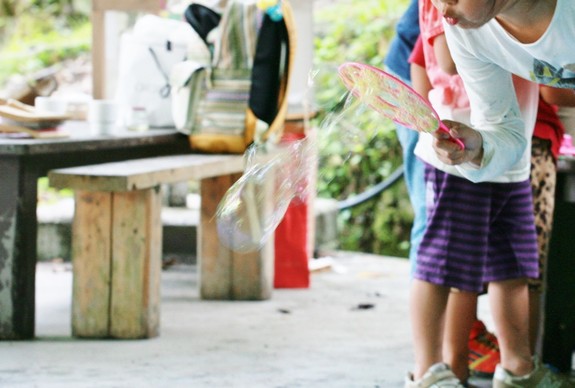 女の子達が色が足りないところに繊細にシャボン玉を吹いてくれている様子