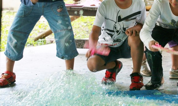男の子達がダイナミックにシャボン玉ゼリータワーを作る様子