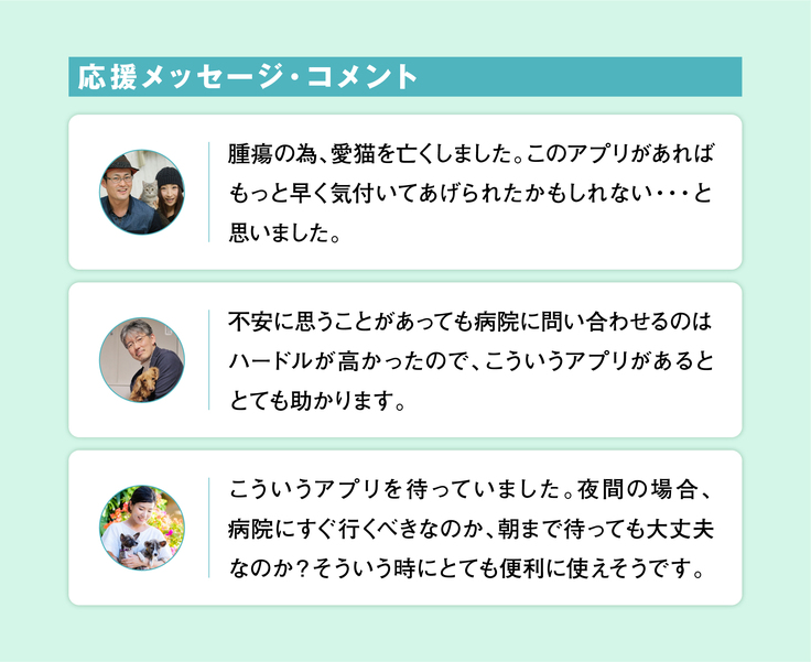 これまでに700人以上の飼い主様に事前登録頂き、200件以上もの応援メッセージが寄せられました。こちらは、事前登録頂いた飼い主様の声をピックアップしたものです。
