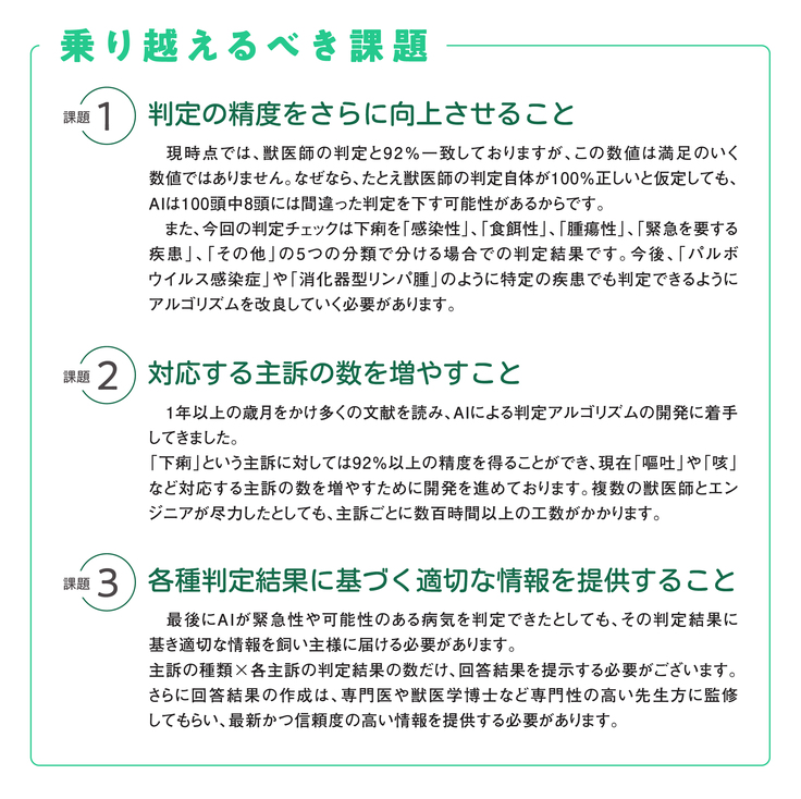 これは、どうぶつを救うためのアプリ開発の大きな一歩ではありますが、このアルゴリズムを実用化するまでには乗り越えなければならない課題がまだまだあります。