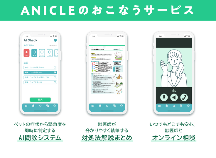 ※初期版リリース時には、ANICLEの運営に携わる数名程度の獣医が対応し、需要に応じて順次全国展開を目指して提携獣医師を増員する予定です。