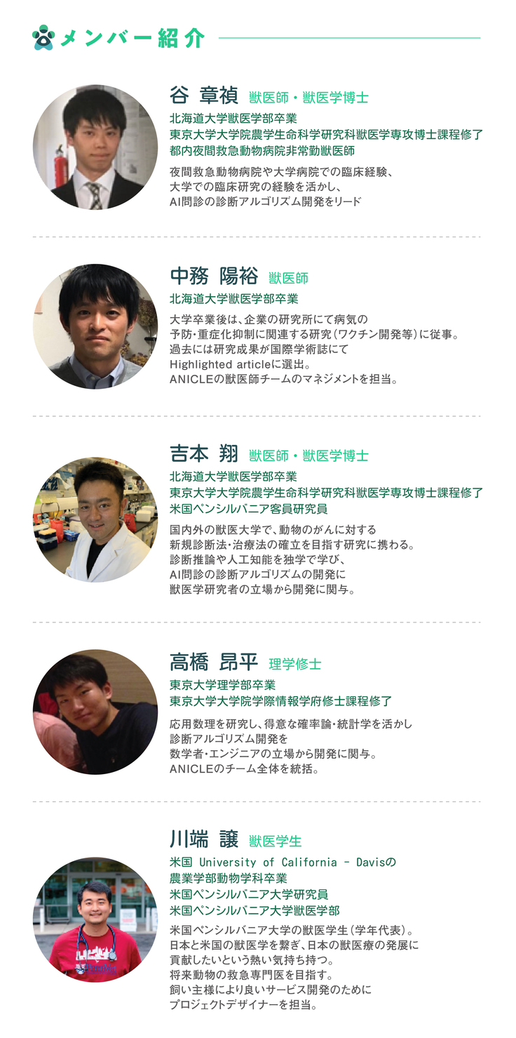 ANICLE(アニクル)は、獣医療を変えたいという熱い想いをもった若手獣医師を中心としたチームです。チームには東京大学や北海道大学を卒業した研究者やエンジニア、さらにアメリカで獣医療を学ぶメンバーも在籍しています。