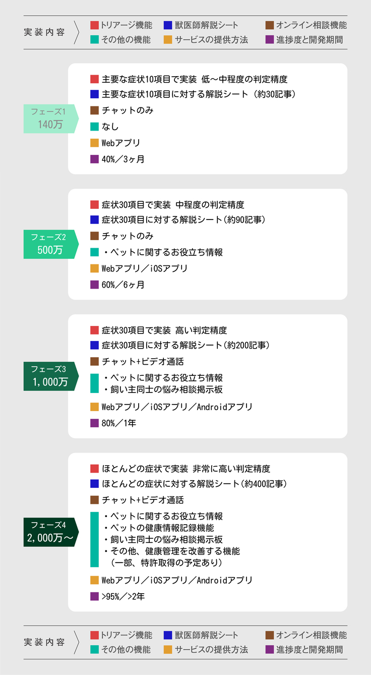 なお、フェーズごとの実装内容を以下にお示しておりますが、人手が必要で難易度の高いプロジェクトのため、適宜変更する場合がございます。予めご了承下さい。