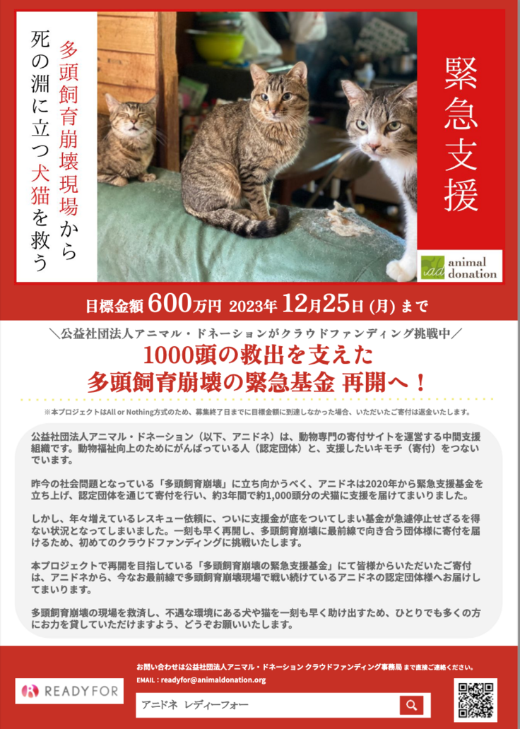 目標金額を達成し、多くの命がレスキューされること、そして今回のプロジェクトを通して多頭飼育崩壊への興味関心がより広がることを心よりお祈り申し上げます。