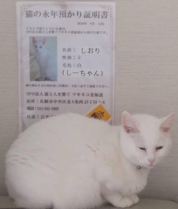 預かる時に、ツキネコ北海道から『猫の永年預かり証明書』が発行されるんですが、これにはしおりちゃんの特徴やツキネコ北海道の連絡先が書いてあるんです。リビングの壁にこれを貼っているので、私に何かあってもツキネコ北海道に連絡をしてもらえると思うと、とても安心です。この制度がなかったら、猫との暮らしを始めることはできなかった。本当に素晴らしいシステムだと思います」