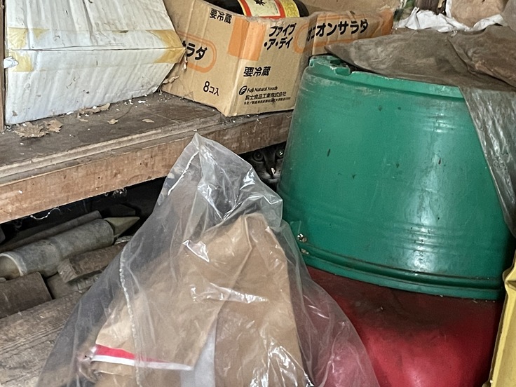 母屋、プレハブ、納屋で増えていた猫は21頭。うち1頭は、居間にリードに繋がれている状態。母屋では、壁とタンスの狭い隙間で複数の母猫が子育てをしていました。