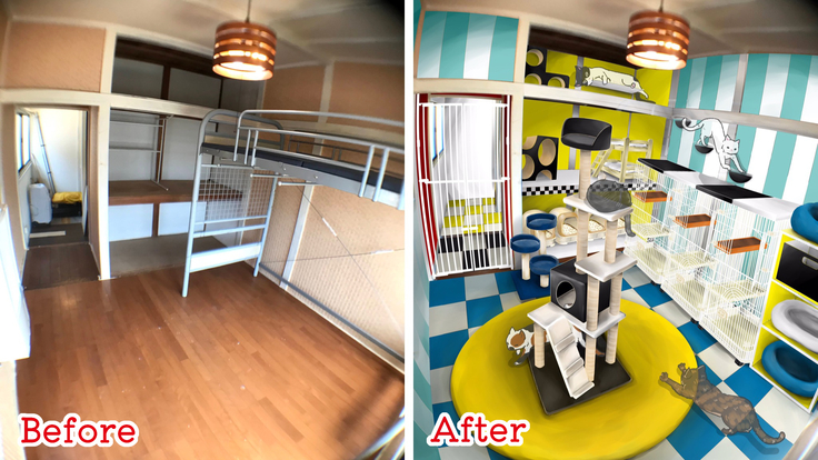猫ちゃんが上下運動できるよう、お部屋の真ん中にキャットタワー・キャットウォークやステップを使って押し入れのスペースも猫ちゃんが快適に過ごせるように。