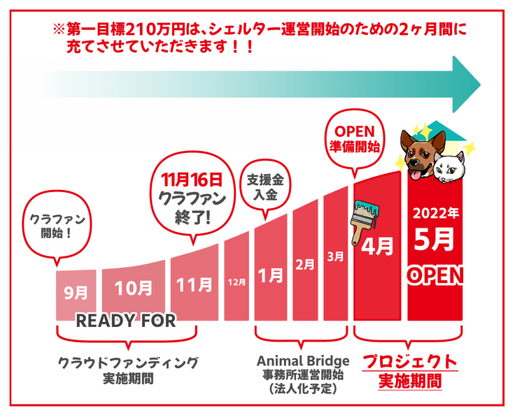 今回、All or Nothing方式でクラウドファンディングに挑むため第一目標の210万円という金額はシェルターをオープンするための最低金額で設定しています。