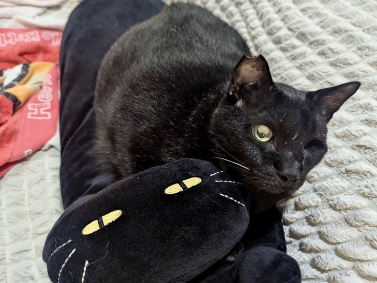 シェルターにお迎えに行くとそこには真っ黒でぽっちゃりで白髪混じりの白内障のおじいさんネコ「みきおさん」がいました。お年寄りの猫と生活するのは初めてだったので接し方に戸惑いましたが、可愛すぎてお年寄りということをすっかり忘れていました。