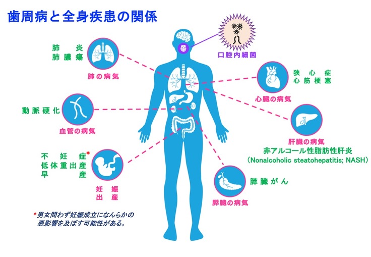歯周病を治療せずに放っておくと、歯周病菌が産生する毒素が歯ぐきの毛細血管を通過して、全身のあらゆる組織に送られ、体中の臓器に悪影響を及ぼします。