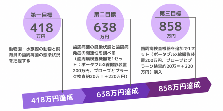 そして、残り4日間という期間ですが、ネクストゴールとして638万円を設定しました。ネクストゴールまでのご支援については、歯周病菌の感染状況と異臭病発生の関連性を調べるため、以下の用途に資金を充てさせていただきます。