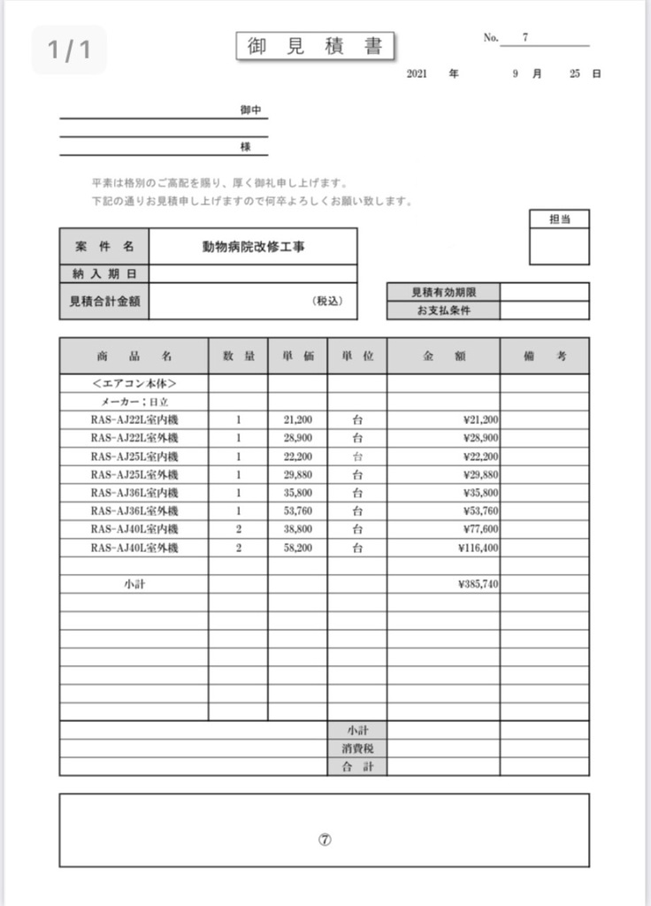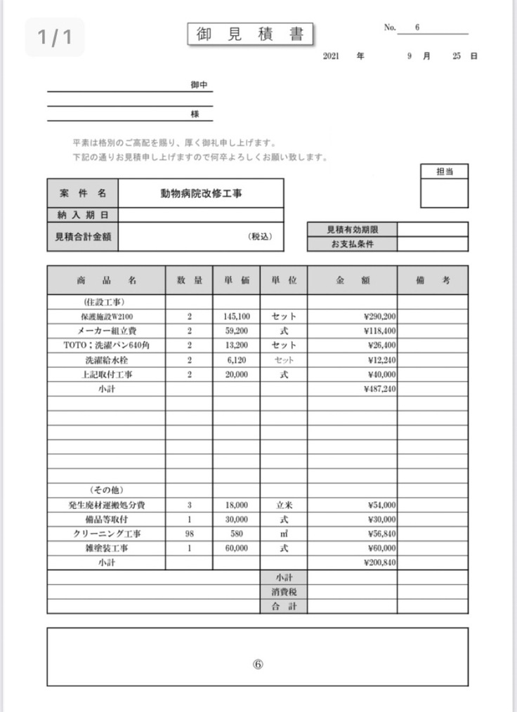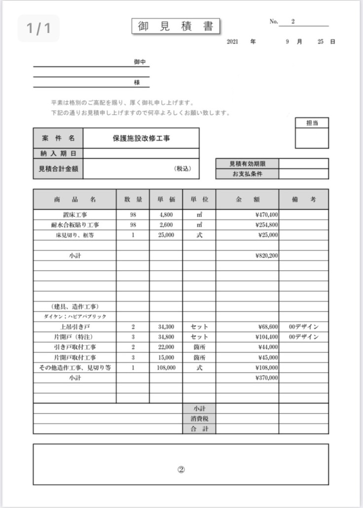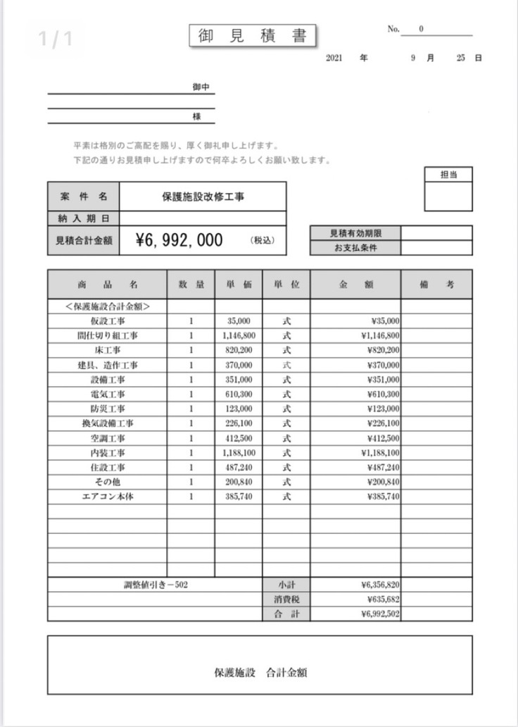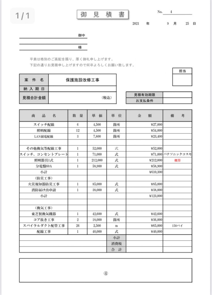 ▼見積書 改装工事にかかわる金額の内訳は以下の通りです。