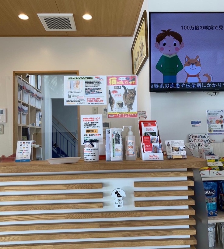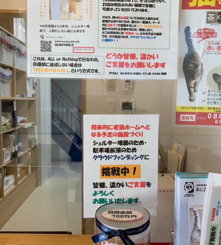 こちらは、シェルターで暮らす猫たちのかかりつけの動物病院です。こちらに今回の挑戦のサポートのために、募金箱を設置いただきました。本当にありがたい援護です。