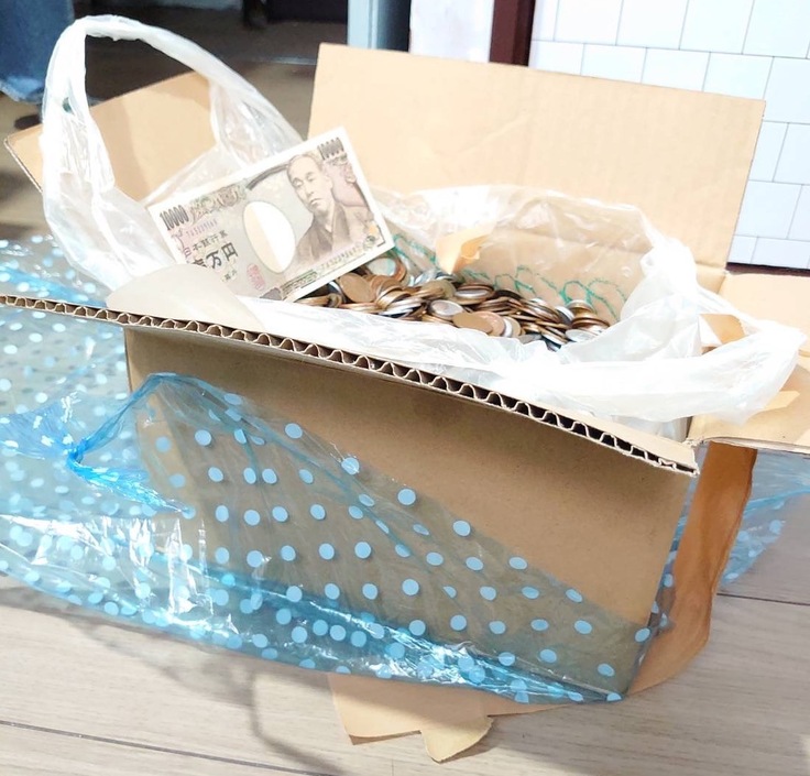 「小銭ばかりでごめんね。銀行に持って行く時に気をつけてね!」と、箱に沢山詰めて来てくださいました(泣)。箱の重さ以上に、この募金には重みを感じます。