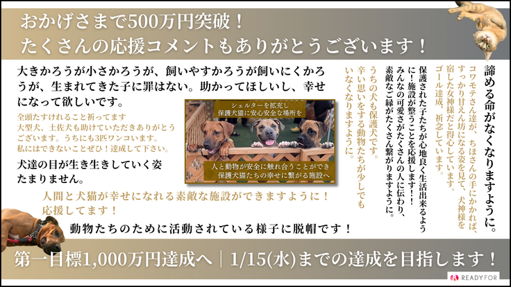 犬猫たちのために絶対に達成したい気持ちが先走り、達成できるのかという不安もございますが、皆さんからたくさんの温かいメッセージを頂戴し、スタッフ一同嬉しく読ませていただいております。心より感謝申し上げます!