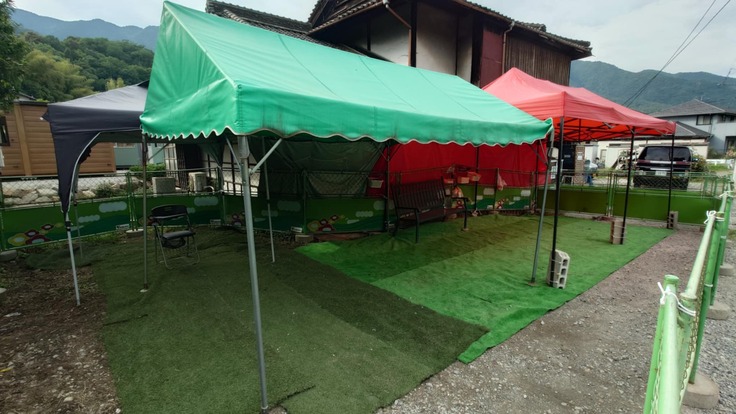 広島は梅雨入りしましたが、運動不足にならないよう古民家の前にテント付きの簡易ドッグランを設置しました!