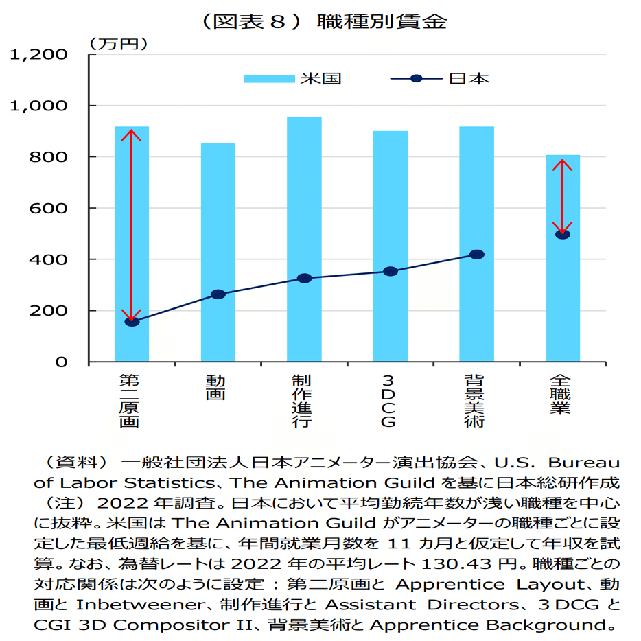 日本総研がまとめた調査を見ると、米国におけるアニメーターの賃金が、日本を大きく上回っていることがわかります。