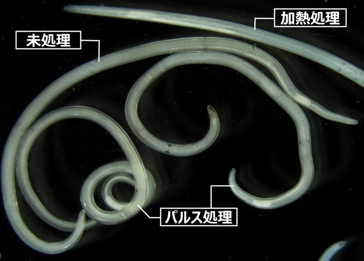 一般的に、電気エネルギーを食品に与えるというと、電子レンジを思い浮かべられ、食品が加熱されることを想像されますが、パルスパワーの持つ②③の特徴がお刺身をほぼ加熱することなくアニサキスの無害化を可能としました。これまでに、アジに潜むアニサキスを無害化できるパルスパワーの条件が明らかになりました。